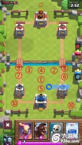 二、三号为进攻建筑的放置位置,如 【连弩】【迫击炮】。我们在这里可以最大程度的对敌方防御塔造成伤害。同时他们距离河岸的一侧我们可以布下防御,对于对方意图攻击我方防御建筑造成有效拦 截。一般我们在河岸处防御放下【加农炮】【女武神】【骷髅兵】【哥布林组合】等低费同时可以阻拦对方的单卡。