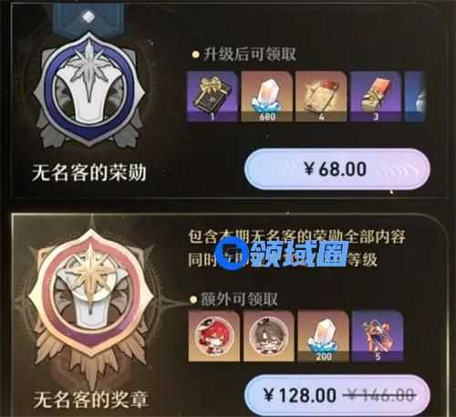 首先大月卡分为两种分别是:【无名客的荣勋】68元和【无名客的奖章】128元,这两种当中【无名客的奖章】128只比前者多出了两个限定头像和200星琼以及直升10级通行证等级,所以性价比并不高,是氪佬以及收集党的选择,平民购买68的就行。
