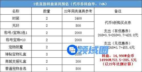 4、第1-2套总花费428.8元,总回血15617w游戏币,6/2比例折算250左右,最终花费180左右。