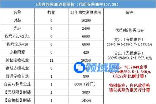 2、今年的礼包价格为26800点券,6套不花费优惠券的话是1527.6元,有券的话每套减26.8元,全部用券共计1393.6元。