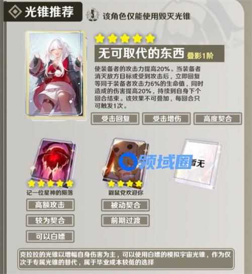 总之以上就是关于游戏当中关于克拉拉的光锥推荐了,这里小编是建议玩家可以优先使用专属光锥【无可取代的东西】,也可以在模拟宇宙当中肝一个【记一位星神的陨落】使用,前期可以使用三星的【天倾】过渡。