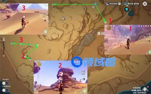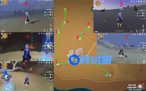 1处稍远,2、3两处圣金虫均在屋顶,且2、3两处可通过四叶印一路飞过去。6、7在地下,6在图中沙漏位置,7在下方石堆处,均已用红圈圈出