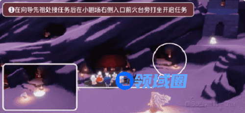 1、在向导先祖处接任务后在小剧场右侧入口前火台旁打坐开启任务。
