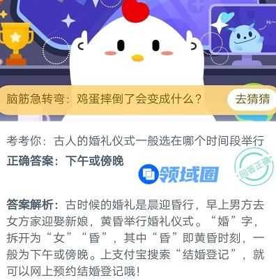 庄园小课堂8月22日题目是:考考你古人的婚礼仪式一般选在哪个时间段举行?用户回答正确会有180g饲料奖励,那么正确答案是什么呢?下面和游戏宝小编一起去了解一下吧。