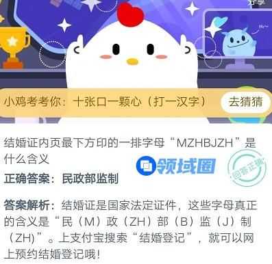 蚂蚁庄园今日8月21日题目结婚证内页最下方印的一排字母MZHBJZH是什么含义?这个问题小编认为算是比较难的吧,毕竟这确实是涉及到了广大单身同胞们的知识盲区。为了帮助同胞们拿到180g饲料,小编马上放出该问题的答案,快一起来看看吧!