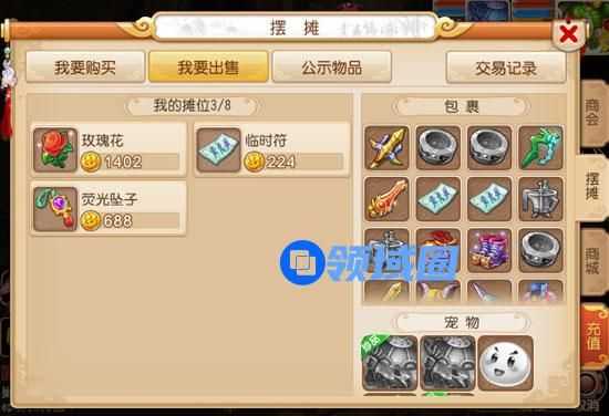 3. 在界面右侧的包裹中选择想出售的物品或者宠物,设置出售价格。