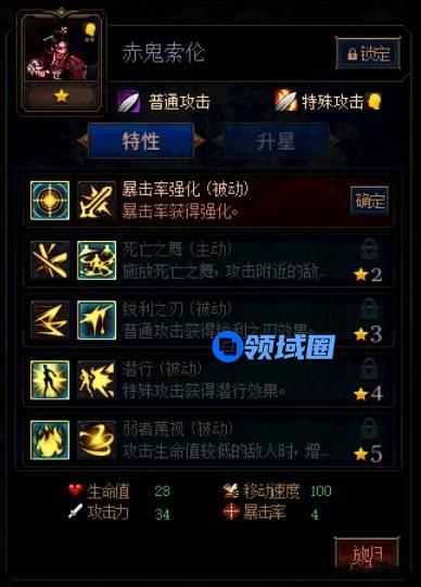 赤鬼索伦是一张后期非常强的输出卡,前期伤害一般,3星后伤害质变,4星获得潜行效果并且主动技能CD减少40%,并对后排的敌人进行突进攻击,加点推荐以暴击为主:暴击率强化、死亡之舞、锐利之刃、潜行、弱者藐视。