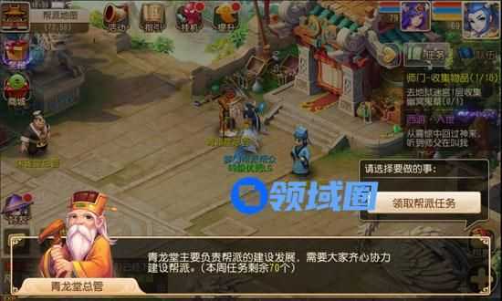 加入了帮派的玩家每周可以在帮派场景内的青龙堂总管处领取帮派任务。帮派任务每10个为 一轮,一共有青龙堂、朱雀堂、玄武堂发放的三种帮派任务可供随机领取。放弃任务也扣除一次帮派任务次数。每周一的0点重置帮派任务完成次数。完成帮派任务 可以获得帮贡、经验、金币、帮派资金等奖励,同时也会为帮派分红池增加一定分红。