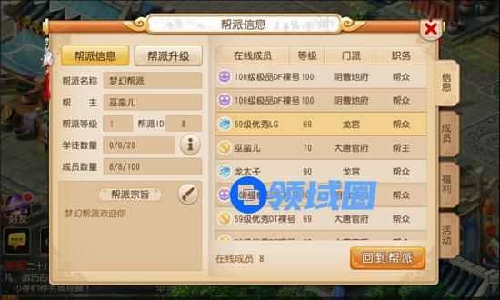 每个帮派有自己的集会场所和帮派频道,帮派的集会场所和聊天频道都是独立的。每个帮派成员都可以回到自己的帮派,利用自己的帮派频道和帮派内的 人互通消息; 帮派成员可以在帮中学到各种辅助技能,如打造技巧、烹饪技巧、炼金术、强身术等等,这些技能可以帮助玩家提高自己在游戏中的生存能力; 帮派成员可以通过完成帮派任务获得经验值奖励; 帮派中还为帮众提供了各种福利,如领取帮派技能、帮派修炼、帮派分红、购买药品等。