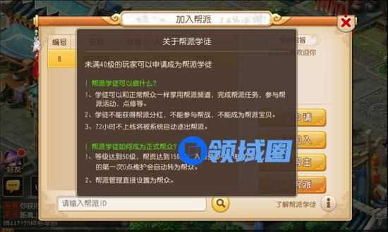 申请加入的帮派如果开启了接收帮派学徒功能,则40级以下的玩家申请会成为此帮派的帮派学徒。帮派学徒与帮派其他成员一起享有帮派频道的一切功 能,也可以完成帮派任务获得相同奖励,可以学习帮派技能,学习帮派修炼。但是帮派学徒不可参加帮战等帮派活动,无法得到帮派分红。学徒可以转变为正式帮 众,具体方法见下图的介绍说明中。