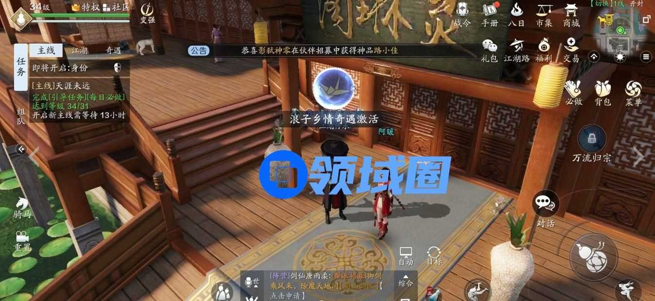 上述条件全部达成后,打开奇遇界面,找到浪子乡情,点击前往,即可自动寻路,继续奇遇任务。少侠们会在灵琳阁门口找到阿暖,因为目前阁主并不在,阿暖便带着少侠四处逛逛。