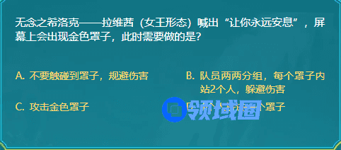 无念之希洛克——拉维茜(女王形态)喊出“让你永远安息”,屏幕上会出现金色罩子,此时需要做的是?这是DNF阿拉德智慧星9月29日题目,下面游戏宝小编为您带来正确答案。