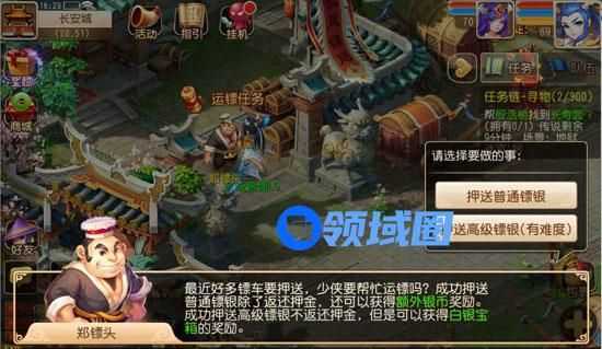 到了30级,就可去去镖局押镖了。长安城(24,65)的郑镖头一直广招三界勇士,为镖局押送镖银。押送镖银需要交纳一定的押金,击败途中出现的劫镖强盗,将镖银押送到目的地后,可以获得价值不菲的佣金哦!