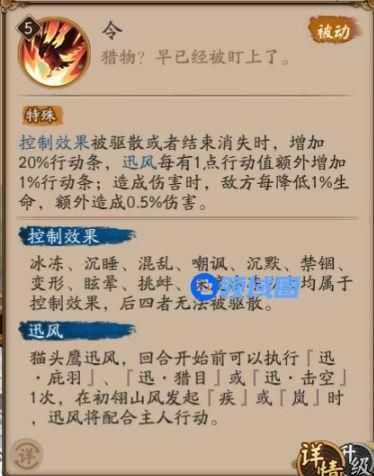 控制效果被驱散或者结束消失时,增加20%行动条,迅风每有1点行动值额外增加1%行动条;造成伤害时,敌方每降低1%生命,额外造成0.5%伤害。