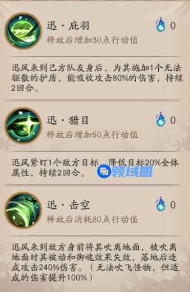 释放后消耗80点行动值迅风来到敌方身前将其吹离地面,被吹离地面时其被动和御魂效果失效,落地后造成攻击240%伤害。( 无法吹飞怪物,但造成的伤害提升100% )