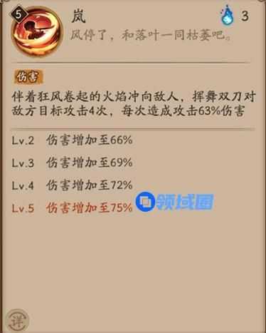 伴着狂风卷起的火焰冲向敌人,挥舞双刀对敌方目标攻击4次,每次造成攻击63%伤害。
