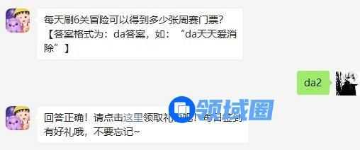 每天刷6关冒险可以得到多少张周赛门票?【答案格式为:da答案,如:“da天天爱消除”】这是天天爱消除3月3日每日一题题目,游戏宝小编为您带来每天刷6关冒险可以得到多少张周赛门票答案。