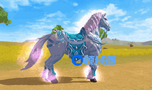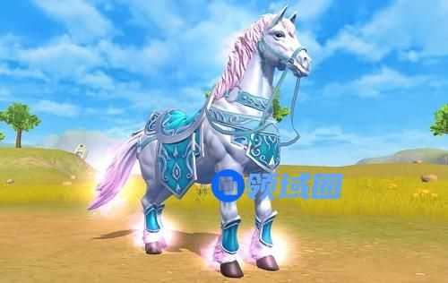雪衣侠骑全身雪白,鬃毛带有浅浅的粉紫色渐变,身上穿戴天蓝色马鞍、缰绳,搭配银色金属装饰,高贵优雅,英姿飒爽。