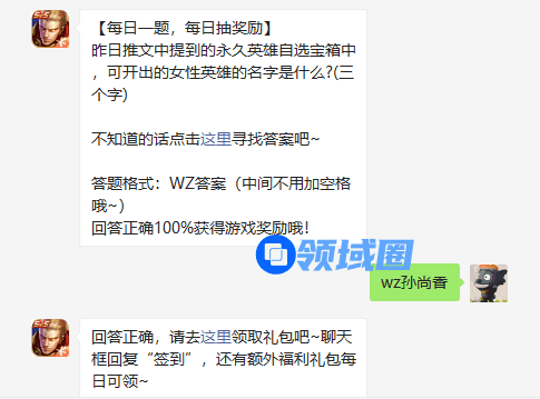 【每日一题,每日抽奖励】昨日推文中提到的永久英雄自选宝箱中,可开出的女性英雄的名字是什么?(三个字)不知道的话点击这里寻找答案吧~答题格式:WZ答案(中间不用加空格哦~)回答正确100%获得游戏奖励哦!