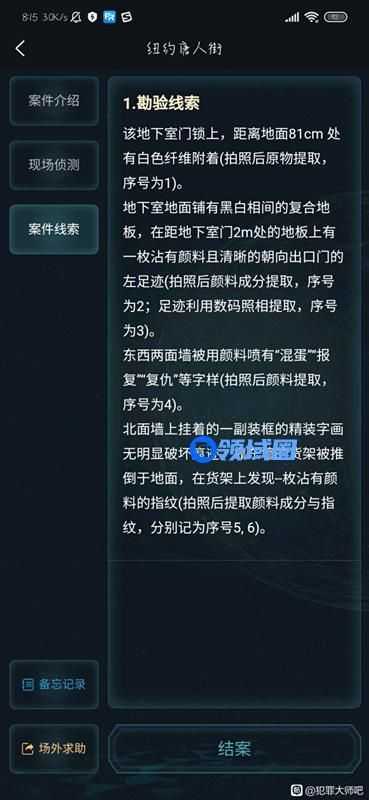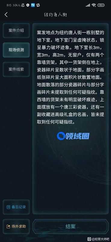 案发地点为纽约唐人街一栋别墅的地下室,地下室门呈虚掩状态,锁呈暴力破坏迹象。地下室长3m,宽3m,高2m,无窗户,仅有两个靠墙货架,其中一货架倒在地上,瓷器碎片呈散状于地面,部分字画纸张碎片呈大面积片状散置地面。地面散落的部分瓷器碎片与部分字画碎片未提取到任何可疑指纹。靠西墙的货架未有明显破坏痕迹,上面摆放有一个唐三彩瓷器,还有一副收藏进高级礼盒的名画,皆未提取到任何可疑指纹。