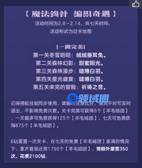 6钻重置一次关卡,在七天的免费【羊毛绒团】拿满的情况下,拿齐套装还需1750个【羊毛绒团】,需额外重置350次,花费2100钻。