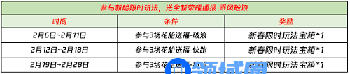 2月6日12:00~2月11日23:59将开启玩法花船送福-破浪对决,喜欢的召唤师不要错过。