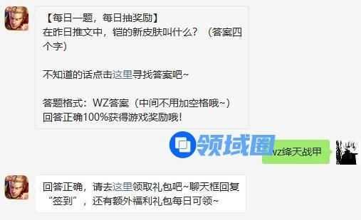 【每日一题,每日抽奖励】在昨日推文中,铠的新皮肤叫什么?(答案四个字)不知道的话点击这里寻找答案吧~答题格式:WZ答案(中间不用加空格哦~)回答正确100%获得游戏奖励哦!