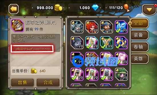 这里使用装备碎片为例,图中红框内显示了合成这件神器【掠夺之斧】所需碎片数量,以及当前拥有碎片数量为99/50。代表每50个掠夺之斧(碎片)可合成一把【掠夺之斧】,我们拥有99个碎片。