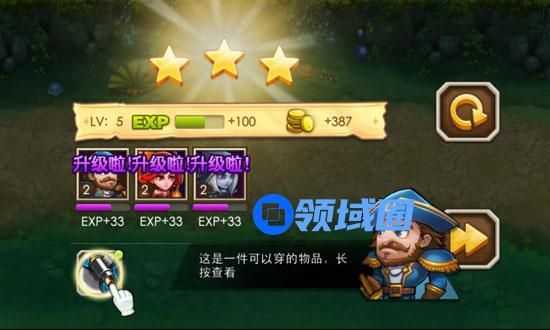 通过关卡!英雄也获得经验并升级了,升级后的英雄各项属性提升,更可穿戴高等级装备。