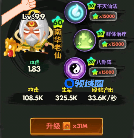 属性方面如上图所示,强度真是高。技能方面有:不灭仙法、八卦阵、群体治疗。