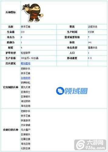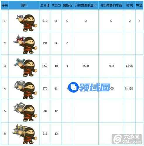 快手忍者等级为1时 ,其生命值为210,攻击力为8,生产时不需要魔晶石,但只能在城堡等级为7时才能开始招募。
