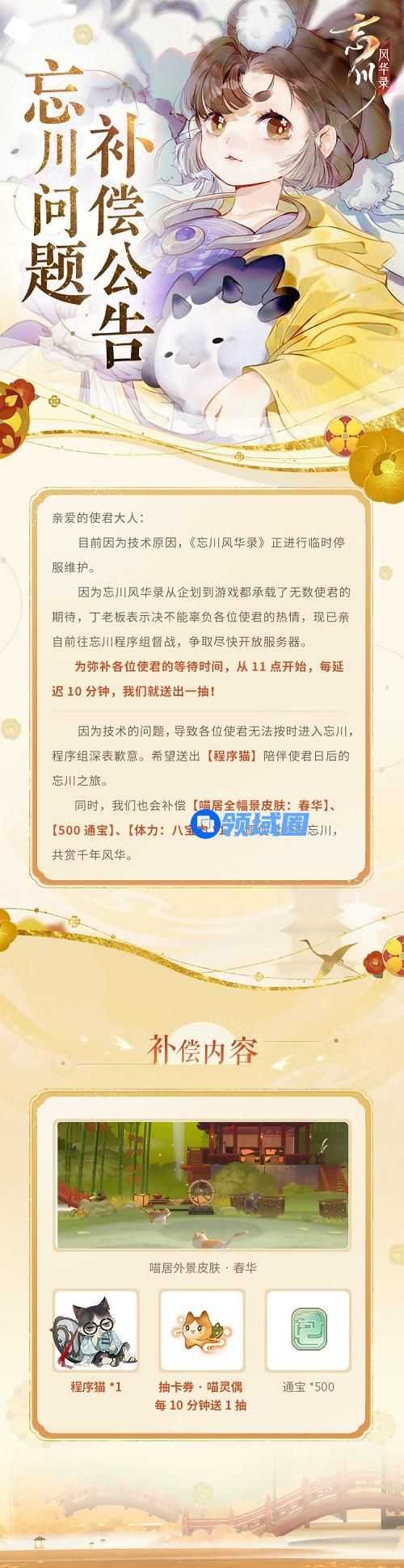 同时,我们也会补偿【喵居全幅景皮肤:春华】、【500通宝】、【体力:八宝肉*1】,愿使君畅游忘川,共赏千年风华。