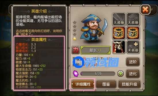 在英雄装备界面点击“详细属性”按钮,可查看英雄的全部属性。