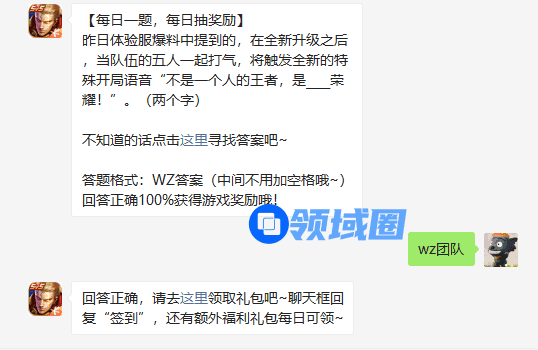 【每日一题,每日抽奖励】昨日体验服爆料中提到的,在全新升级之后,当队伍的五人一起打气,将触发全新的特殊开局语音“不是一个人的王者,是____荣耀!”。(两个字)不知道的话点击这里寻找答案吧~答题格式:WZ答案(中间不用加空格哦~)回答正确100%获得游戏奖励哦!