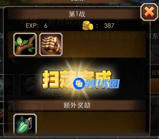扫荡完成后,将显示本次扫荡所得战利品,还有额外奖励呢。