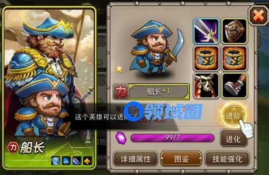 所有初始英雄的品质均为白色,当英雄穿齐全身装备后可以进阶,进阶后的英雄品质将提升为绿色(如图船长头像外框)。每次进阶,英雄都可提升一个品质。