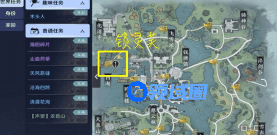 2、第一味药材锁灵芙,先到江南交互后会有一段动画和植物生长的线索,药材位置在江南的西湖,到了西湖就会找到触发任务。