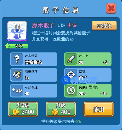 史诗骰子,可以变幻,他类似于一个低配版的进化骰子。惊喜的是,他进化后可以返还一定数量的SP,这就还有点强了。不错的一个辅助骰子。他可参与的骰组阵容还是挺多的。