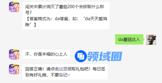闯关中累计消灭了蘑菇200个会获取什么称号?【答案格式为:da答案,如:“da天天爱消除”】这是天天爱消除3月24日每日一题,游戏宝小编为您带来闯关中累计消灭了蘑菇200个会获取什么称号答案分享。