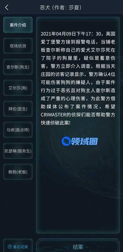 2021年04月09日下午17:30,英国爱丁堡警方接到报警电话,当铺老板查尔斯称自己的爱犬艾尔莎死在了院子的狗屋里,疑似是蓄意伤害,警方立即介入调查,根据当天庄园的访客记录显示,警方确认4位可能伤害狗狗的嫌疑人,由于案件行为过于恶劣且对狗主人查尔斯造成了严重的心理伤害,为此警方借助媒体公布了案件情况,希望CRIMASTER的侦探们能否帮助警方快速侦破此案!
