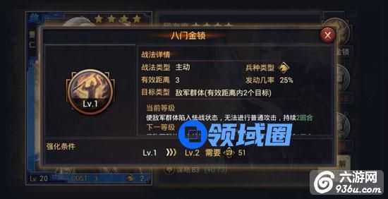 自身成长较高,八门金锁控制普攻,无战必断金的情况下,能提供相对优秀的控制。作为一线前锋长期活跃在战场上,可进一步加强控制或者使用破甲等战法加强输出。