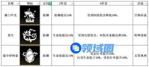 4件套效果:受治疗率提高20%。自身生命值低于30%时,受治疗率提高40%。