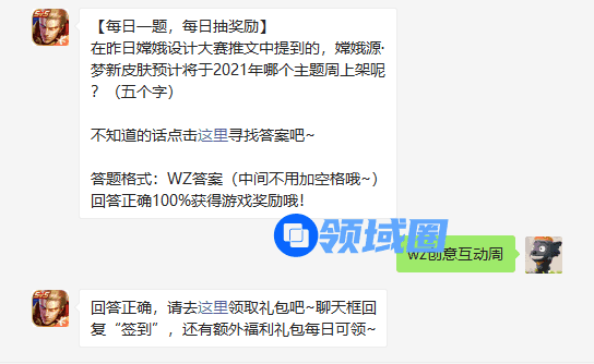 【每日一题,每日抽奖励】在昨日嫦娥设计大赛推文中提到的,嫦娥源·梦新皮肤预计将于2021年哪个主题周上架呢?(五个字)不知道的话点击这里寻找答案吧~答题格式:WZ答案(中间不用加空格哦~)回答正确100%获得游戏奖励哦!