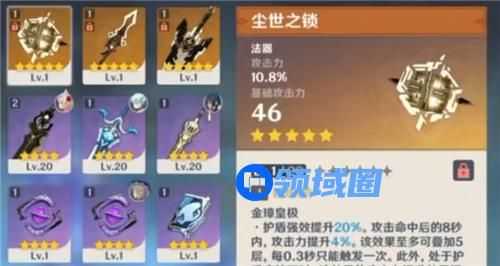 精炼一阶攻击力加成:4%*5层*(1+100%[护盾下])=40%攻击力。另外尘世之锁副属性词条,也是增加百分比攻击力,拉满增加100%攻击力都是可以的。然后圣遗物带双暴词条,便能让伤害最大化。