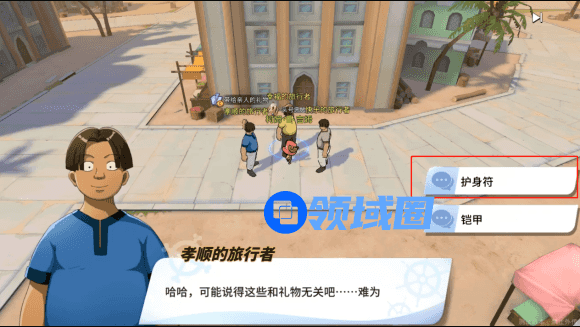 孝顺的旅行者准备给年龄较大的母亲带个礼物,推荐护身符即可。护身符是刚才走丢小女孩母亲送的,得先完成那个任务。