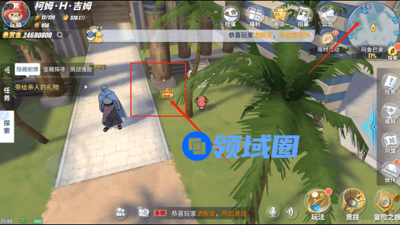 从南门港口处直接上来,一旁的椰子树下有个宝箱,但宝箱被密码锁着,找密码线索的话,需要逆时针依次前往4个城门旁的椰子树下获得密码线索。