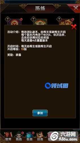 进入该副本需要等级达到15级,同时你也要加入一个帮派。帮派副本可以获取装备宝箱。记住,每个帮派每天只能开启一次,只有帮派帮主、副帮主才能开启帮派副本。副本内BOSS等级开放20-70级团队副本。