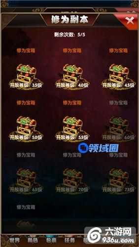 玩家达到35级时开启修为副本,每天挑战次数为1次,提升VIP可以增加新的挑战次数通过副本可以获取修为丹与金币奖励,当挑战成功后才能开启下一等级宝箱,通过成功后可以扫荡副本。