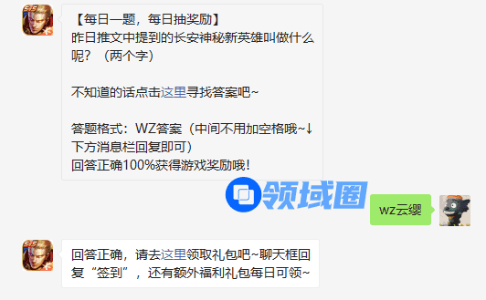 【每日一题,每日抽奖励】昨日推文中提到的长安神秘新英雄叫做什么呢?(两个字)不知道的话点击这里寻找答案吧~答题格式:WZ答案(中间不用加空格哦~↓下方消息栏回复即可)回答正确100%获得游戏奖励哦!