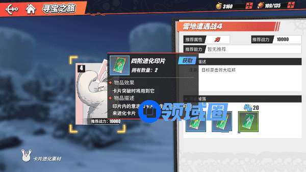 1、进化印片:想要进阶到三星洗练,四阶进化印片是必要道具,可以通过游戏中副本寻宝之旅的雪地遭遇战获取,不过需要玩家主线副本达到第十四章才能开启。